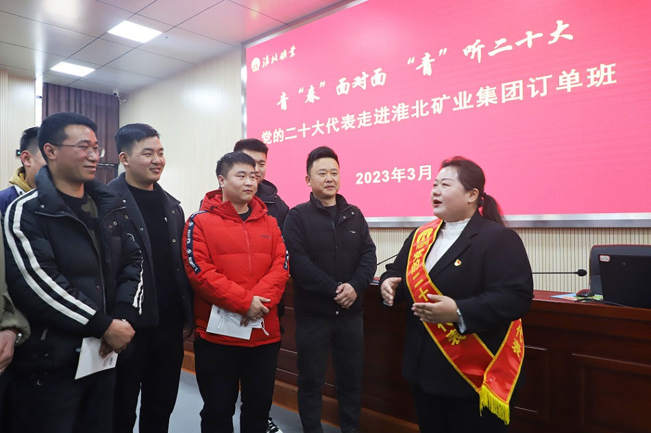 (2023年3月2日,黨的二十大代表劉婉春走進(jìn)淮北礦業(yè)集團(tuán)“訂單班”,面對面向訂單班學(xué)員宣講黨的二十大精神。)