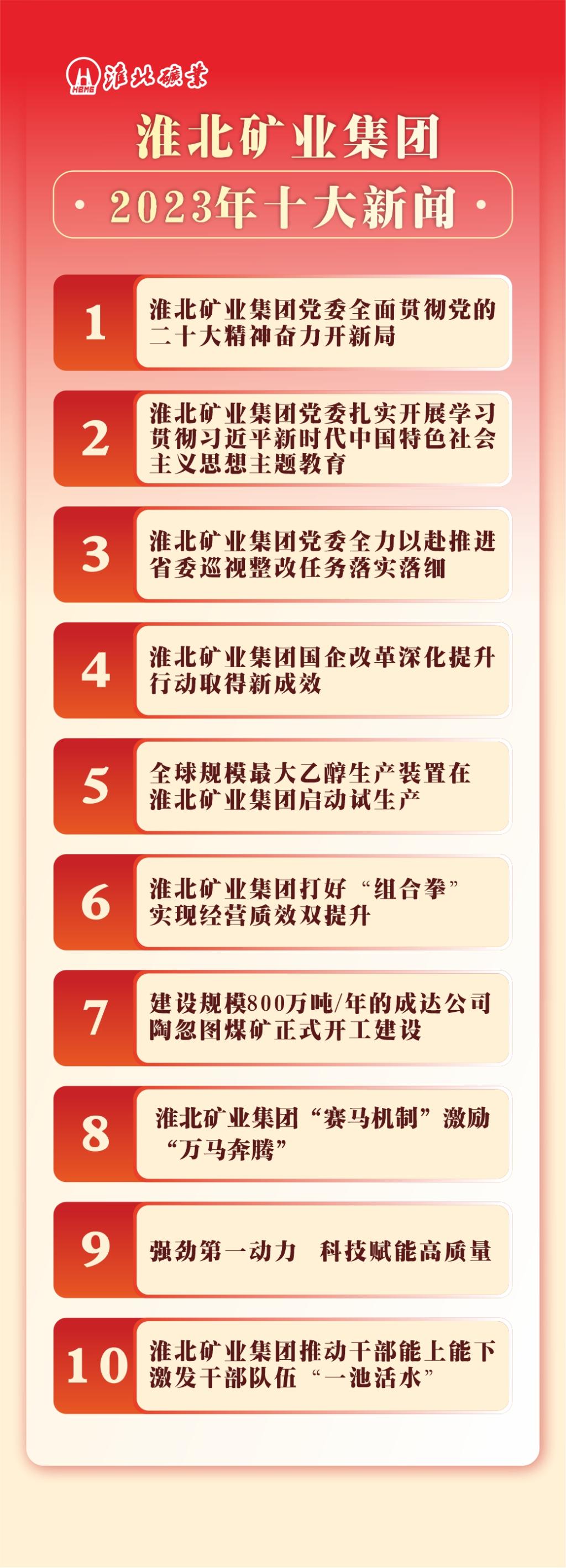2023年是全面貫徹黨的二十大精神的開局之年,淮北礦業(yè)集團(tuán)黨委把學(xué)習(xí)宣傳貫徹黨的二十大精神作為首要政治任務(wù),在全面學(xué)習(xí)、全面把握、全面落實(shí)上下功夫、求實(shí)效,著力引導(dǎo)廣大黨員干部職工把思想和行動統(tǒng)一到黨的二十大精神上來,把智慧和力量凝聚到黨的二十大提出的目標(biāo)任務(wù)上來,奮力譜寫高質(zhì)量發(fā)展新篇章。一年來,集團(tuán)黨委舉辦“黨的二十大精神輪訓(xùn)班暨中高層管理人員領(lǐng)導(dǎo)力素質(zhì)提升班”,開設(shè)“學(xué)習(xí)宣傳貫徹黨的二十大精神”“黨的二十大精神在礦區(qū)”宣傳專欄,開展“舉旗幟·送理論”等各類專題宣講1400余場次,推動黨的二十大精神入腦入心、落地生根,交出了一份精彩答卷。集團(tuán)領(lǐng)導(dǎo)班子先后7年在省委綜合考核中被評為“優(yōu)秀”,2022年度選人用人工作總體評價(jià)滿意度在21家省管企業(yè)中排名第一;集團(tuán)公司紀(jì)委連續(xù)4年在省紀(jì)委監(jiān)委考核中被評為“優(yōu)秀”;集團(tuán)公司先后在省委主題教育座談會、全省組織工作會、全省基層思想政治工作交流會上作發(fā)言;主題教育、省委巡視整改成效均被評為“好”的等次。企業(yè)發(fā)展逆勢而進(jìn),全年?duì)I業(yè)收入、利潤總額均創(chuàng)歷史新高,位居全省“賽馬”第一方陣。